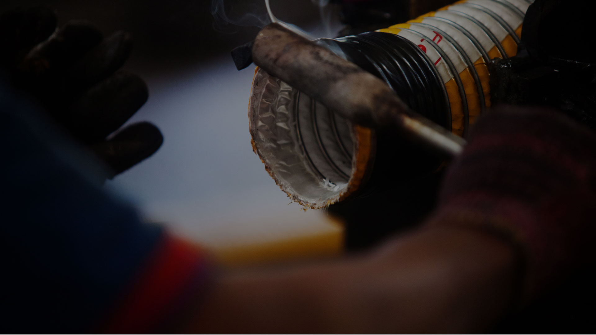 Industrial scene showing complex metal pipes and flow control valves.